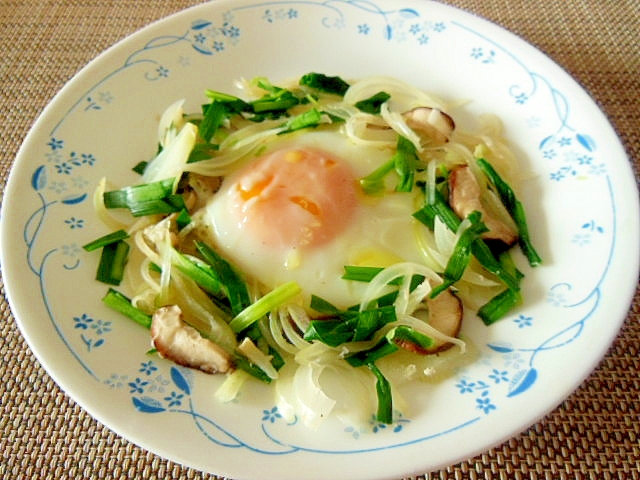 にらと玉ねぎとシイタケの巣ごもり卵 レシピ 作り方 By エゾモモンガさん 楽天レシピ